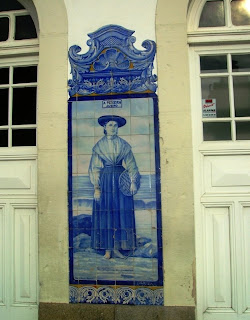 Bem, mas como todos os cães têm sorte, eis senão quando uma mocita aí da terra tirou a respectiva másquina da bolsa da terceira camada de prateleiras da 59.ª secção do lado direito da mala de senhora que delicadamente transportava ao ombro sem receio de assaltos (às tantas esqueceu-se que Aveiro vem no Mapa das Estradas de Portugal...), e vira milho! Não uma, não duas, não três, mas sim oito excelentes fotos com uma bela cor e uma óptima definição duns belos painéis de azulejos!